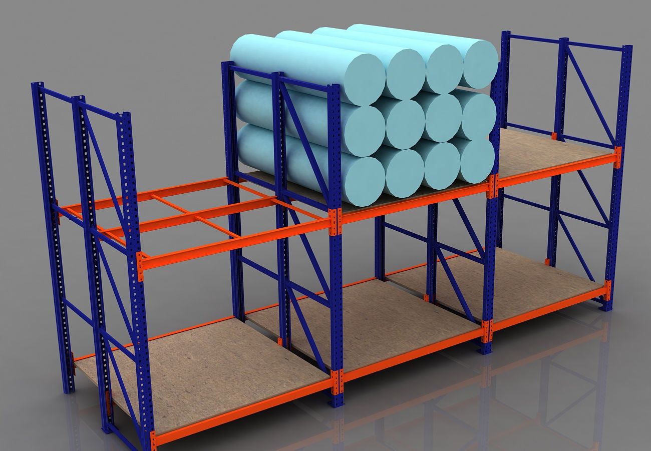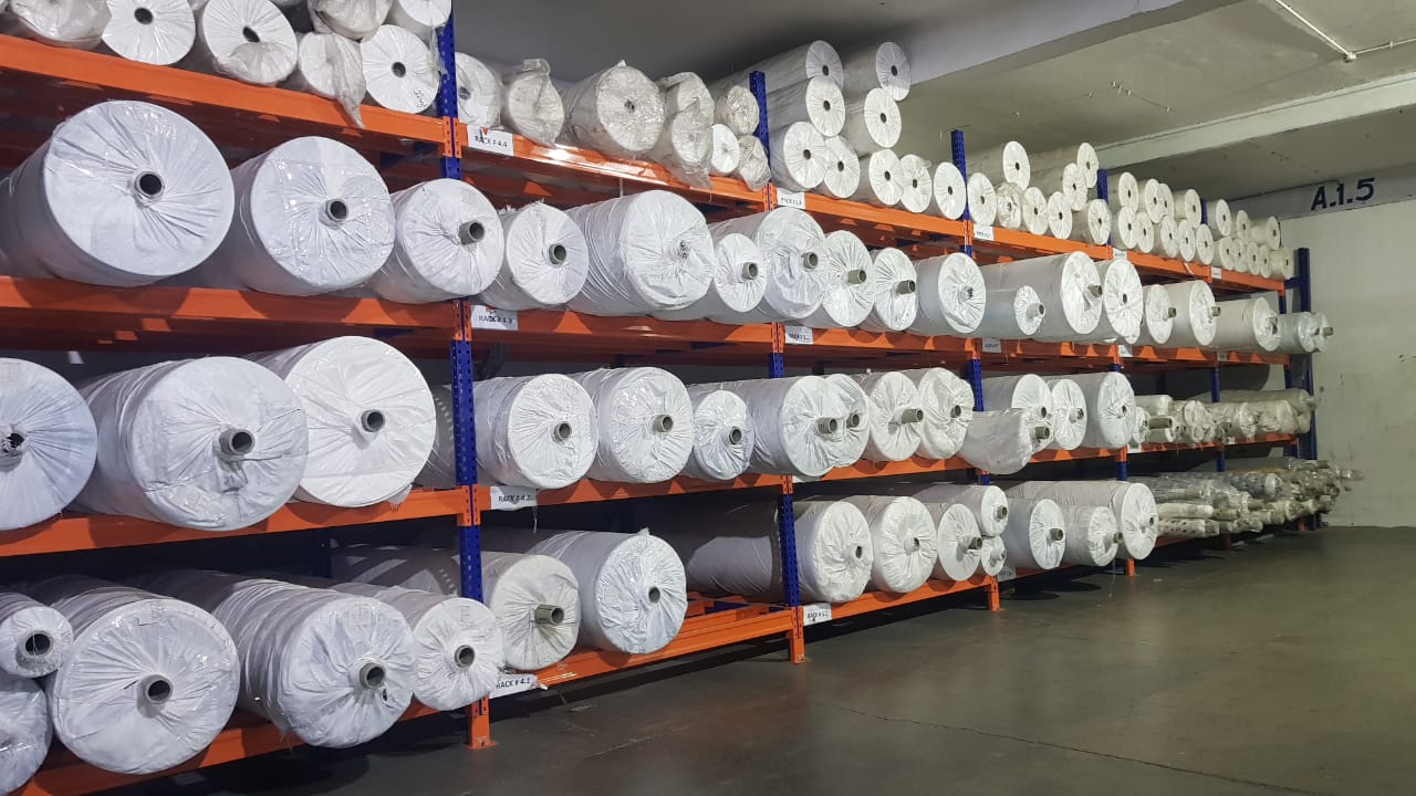 Storing fabric within a stockroom requires a specific style of shelving that provides enough depth to cope with long rolls of cloth also material. Fabric Roll Storage Racks has a close relation to carpet racking. This type of storage system is build from our standard heavy duty components. To achieve the require shelf depth two shelving bays are position one behind the other. Large sheets of chipboard bridge the gap between them, creating a nice flat surface for the fabric rolls to easily slide in and out of the rack.